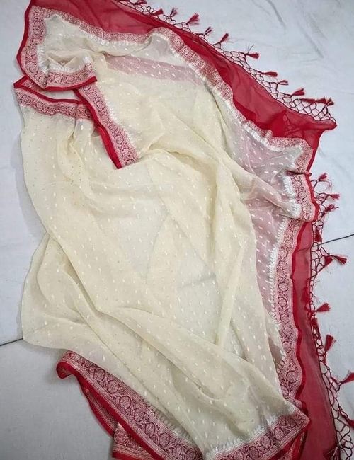 Cream Red Pure Handloom Khaddi Georgette Silk Silver Motifs Weaved Dupatta
