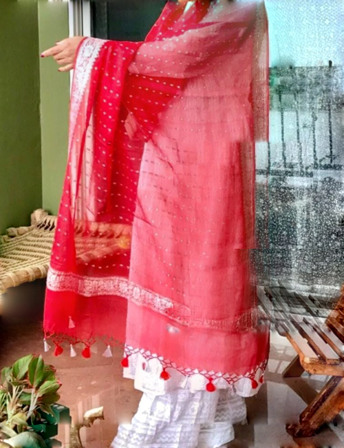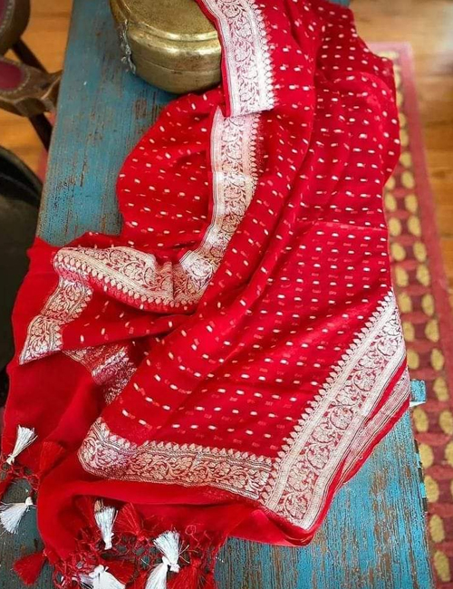 Enquiry for Red Pure Handloom Khaddi Georgette Silk Silver Motifs Weaved Dupatta