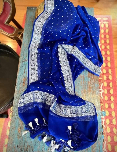 Blue Pure Handloom Khaddi Georgette Silk Silver Motifs Weaved Dupatta