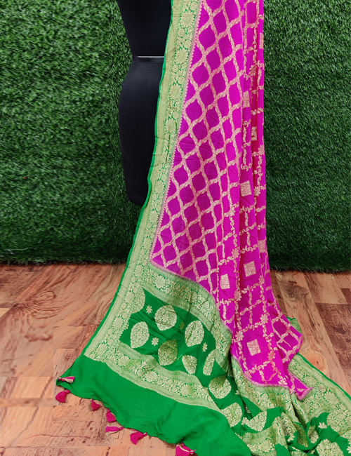 Red Green Pure Chiffon Silk With Gold Zari Weaved Dupatta