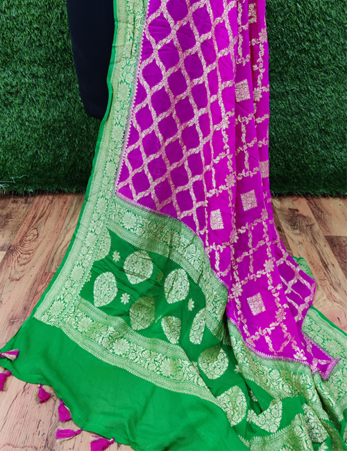 Purpal Green Pure Chiffon Silk With Gold Zari Weaved Dupatta
