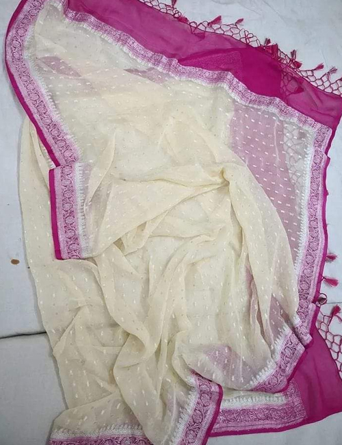 Cream Red Pure Handloom Khaddi Georgette Silk Silver Motifs Weaved Dupatta
