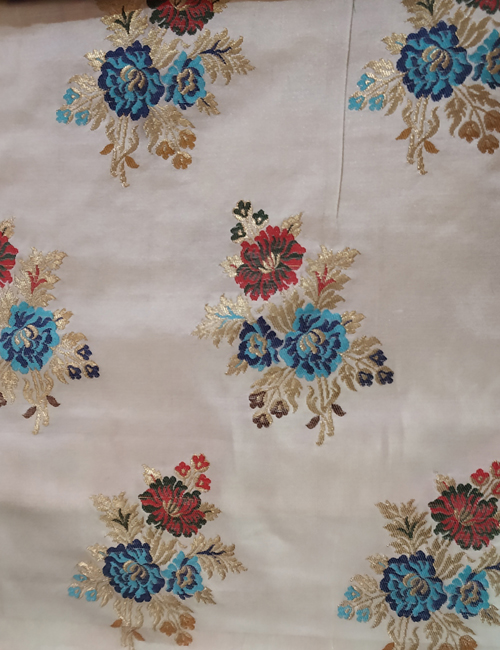 Kimkhab Brocade is a class of richly decorative shuttle woven fabric. It is heavy design brocade. Often made in colored silks. It is a supplementary weft technique. It is used in designing dresses and for upholstery. During the Mughal period (1556–1707), when kimkhwab was extremely popular with the rich, the great centres of brocade weaving were Benares (Varanasi).
